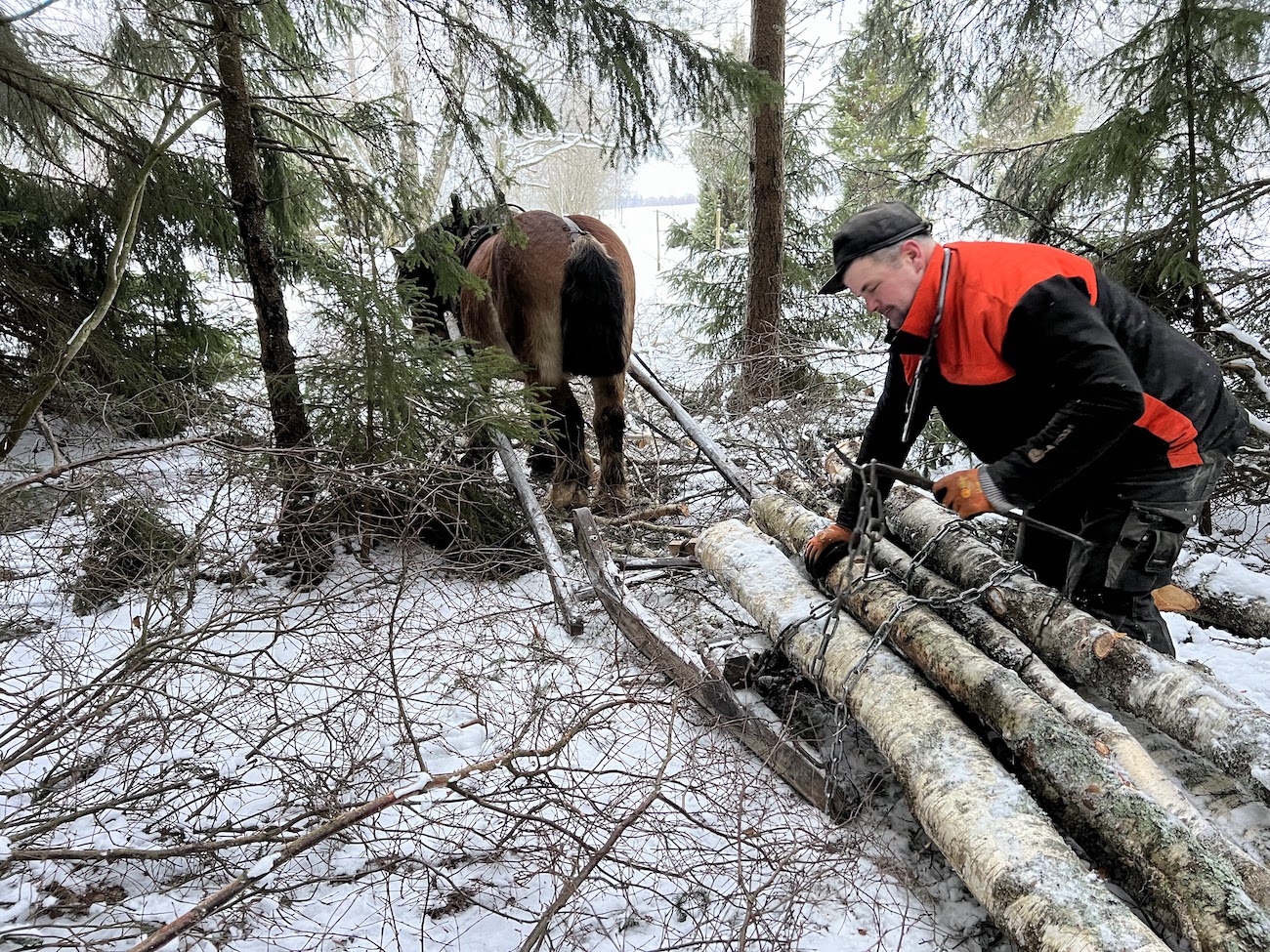 I byn arbetar Martin och Robust med att dra ut timmer. Corren har varit på besök och intervjuat honom....